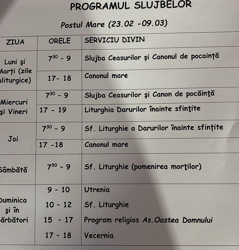 Parohia ortodoxă „Sfântul Ilie” din Baia Mare, str. Victor Babeș, ne prezintă programul slujbelor prilejuite de Postul Mare până în 9 martie.