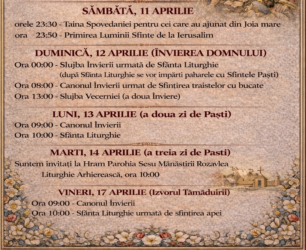 Credincioșii sunt invitați să participe la slujbele dedicate Marelui Praznic al Învierii Domnului și Săptămânii Luminate, organizate de Parohia Ortodoxă „Sfinții Arhangheli Mihail și Gavril Nănești”, în perioada 11–17 aprilie. Programul liturgic cuprinde slujbe speciale în Noaptea de Înviere, dar și în zilele următoare, dedicate Săptămânii Luminate.