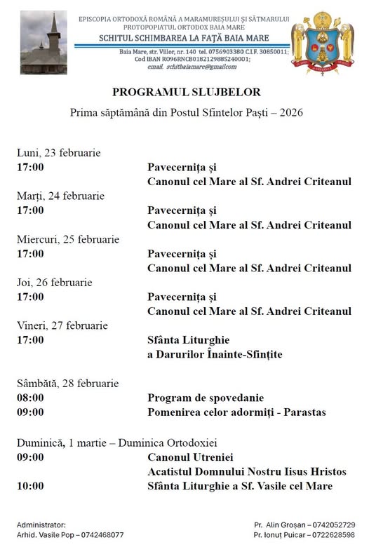 Începând de luni, 23 februarie, perioada Postului Sfintelor Paști, la Schitul Schimbarea la Față din Baia Mare programul de rugaciune obișnuit se va îmbogăți cu slujbe specifice acestui timp liturgic pe care îl parcurgem.