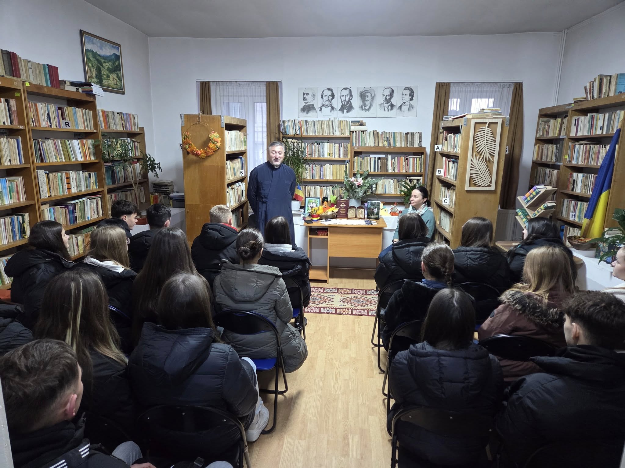 În ajunul sărbătorii 𝑆𝑓𝑎̂𝑛𝑡𝑢𝑙𝑢𝑖 𝐼𝑒𝑟𝑎𝑟ℎ 𝑁𝑖𝑐𝑜𝑙𝑎𝑒, tema cea mai potrivită pentru întâlnirea părintelui Iulian Szerasz cu elevii clasei a XI-a de la Liceul Teoretic „Bogdan Vodă” din Vișeu de Sus, însoțiți de doamna dirigintă Ana Andreica, a fost aceea de a ne apropia de sfinți. Tema propusă: „𝐒𝐟𝐢𝐧𝐭̦𝐢𝐢 – 𝐦𝐨𝐝𝐞𝐥𝐞 𝐩𝐞𝐧𝐭𝐫𝐮 𝐭𝐢𝐧𝐞𝐫𝐢” Întâlnirea a început sub lumina versetului: „𝑀𝑖𝑛𝑢𝑛𝑎𝑡 𝑒𝑠𝑡𝑒 𝐷𝑢𝑚𝑛𝑒𝑧𝑒𝑢 𝑖̂𝑛𝑡𝑟𝑢 𝑠𝑓𝑖𝑛𝑡̦𝑖𝑖 𝐿𝑢𝑖”(Ps. 67, 36). Aceste cuvinte ne arată că Dumnezeu Se descoperă oamenilor prin alți oameni – nu prin personaje perfecte sau supereroi, ci prin oameni asemenea nouă: cu slăbiciuni, cu frici, cu încercări. Diferența este că ei au avut curajul și încrederea să-L lase pe Dumnezeu să lucreze în viața lor.Discuția a continuat prin câteva întrebări firești pentru tineri: Cine sunt sfinții? De ce sunt vrednici să îi urmăm? Au avut și ei ispite și neputințe?