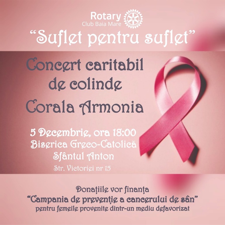 In data de 5 decembrie 2019, Rotary Club Baia Mare organizeaza concertul caritabil “Suflet pentru suflet” pentru derularea unei noi campanii de constientizare, prevenire si depistare precoce a cancerului la san.