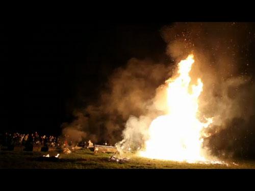 Evenimentul se desfășoară la miezul nopții, în momentul în care focul este aprins, marcând simbolic purificarea și renașterea spirituală. Tradiția este însoțită de un moment emoționant: un grup de bărbați aflați pe coastă rostește în cor „Hristos a Înviat!”, iar răspunsul „Adevărat a înviat!” vine din turla bisericii, unde un alt grup duce mai departe acest dialog simbolic. Ecoul acestor cuvinte se răspândește peste sat, creând o atmosferă profundă și un sentiment de unitate.