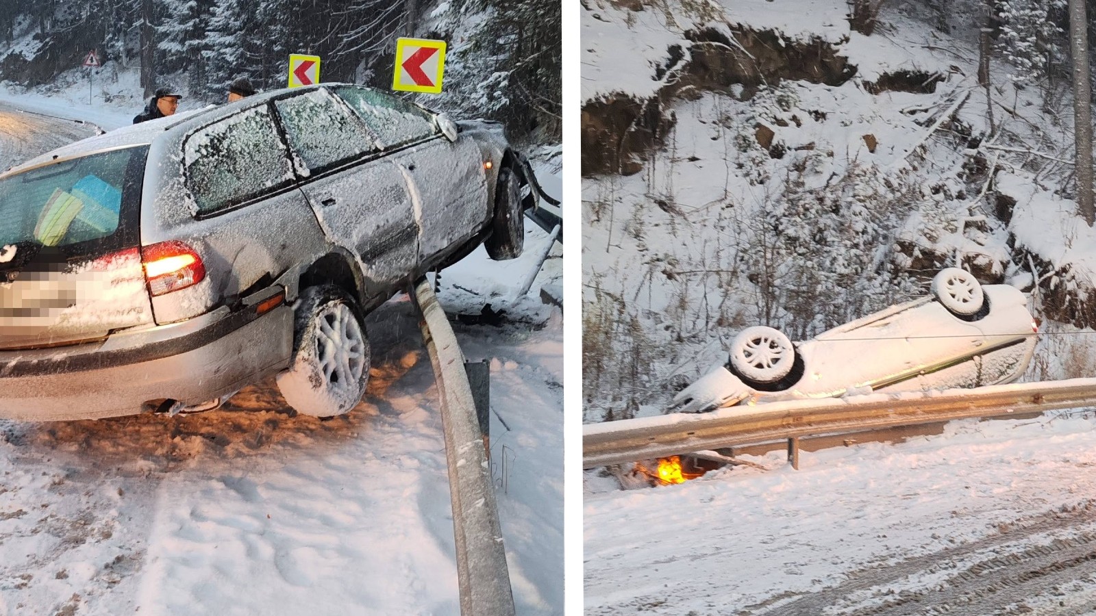 Într-o curbă periculoasă, un autoturism a derapat pe carosabilul acoperit de zăpadă și s-a răsturnat în afara drumului, pe plafon. Din fericire, incidentul nu s-a soldat cu victime grave.